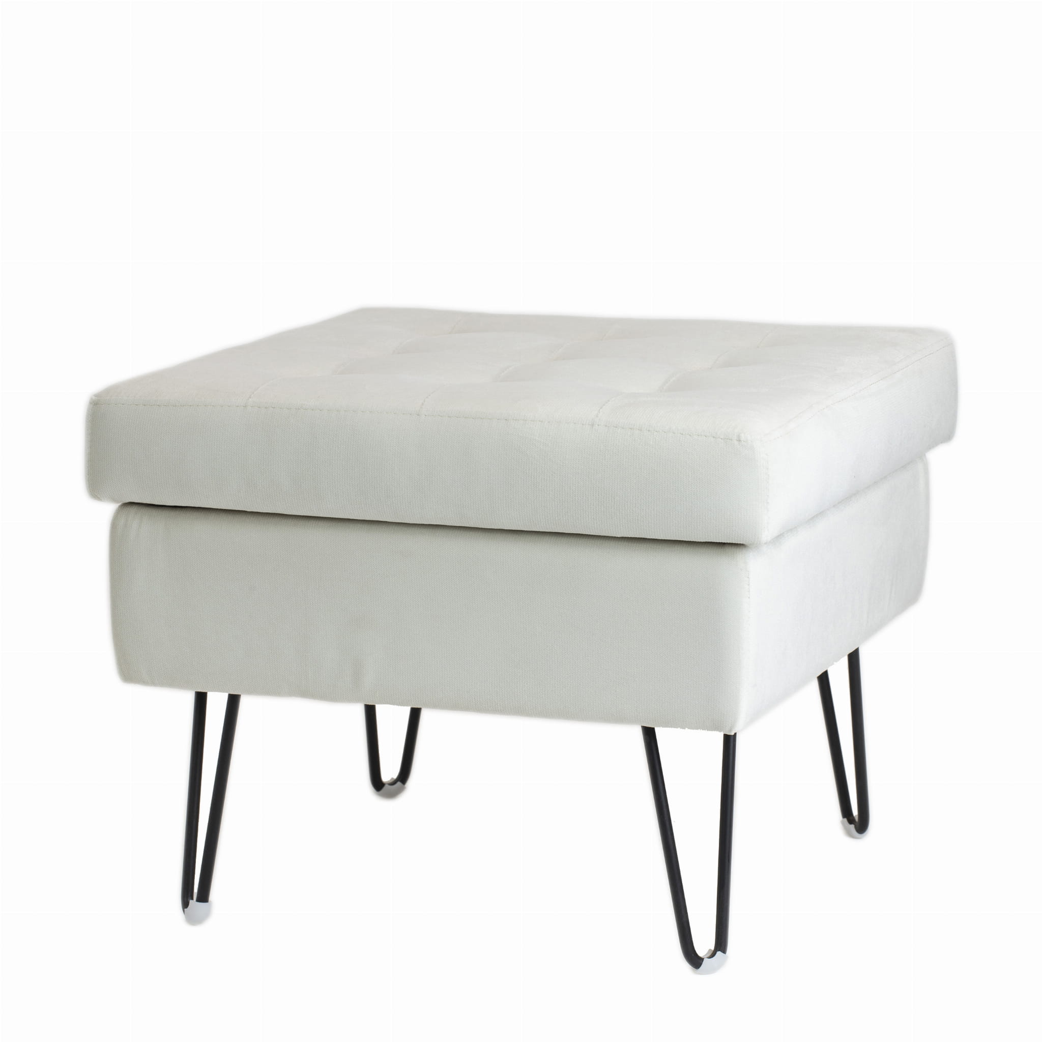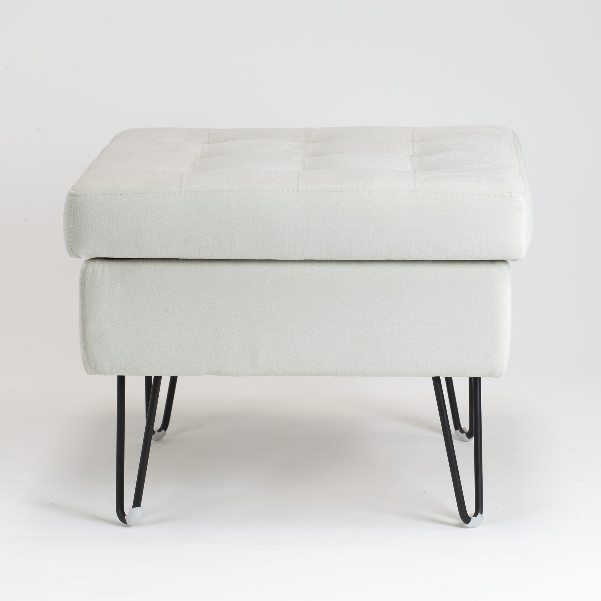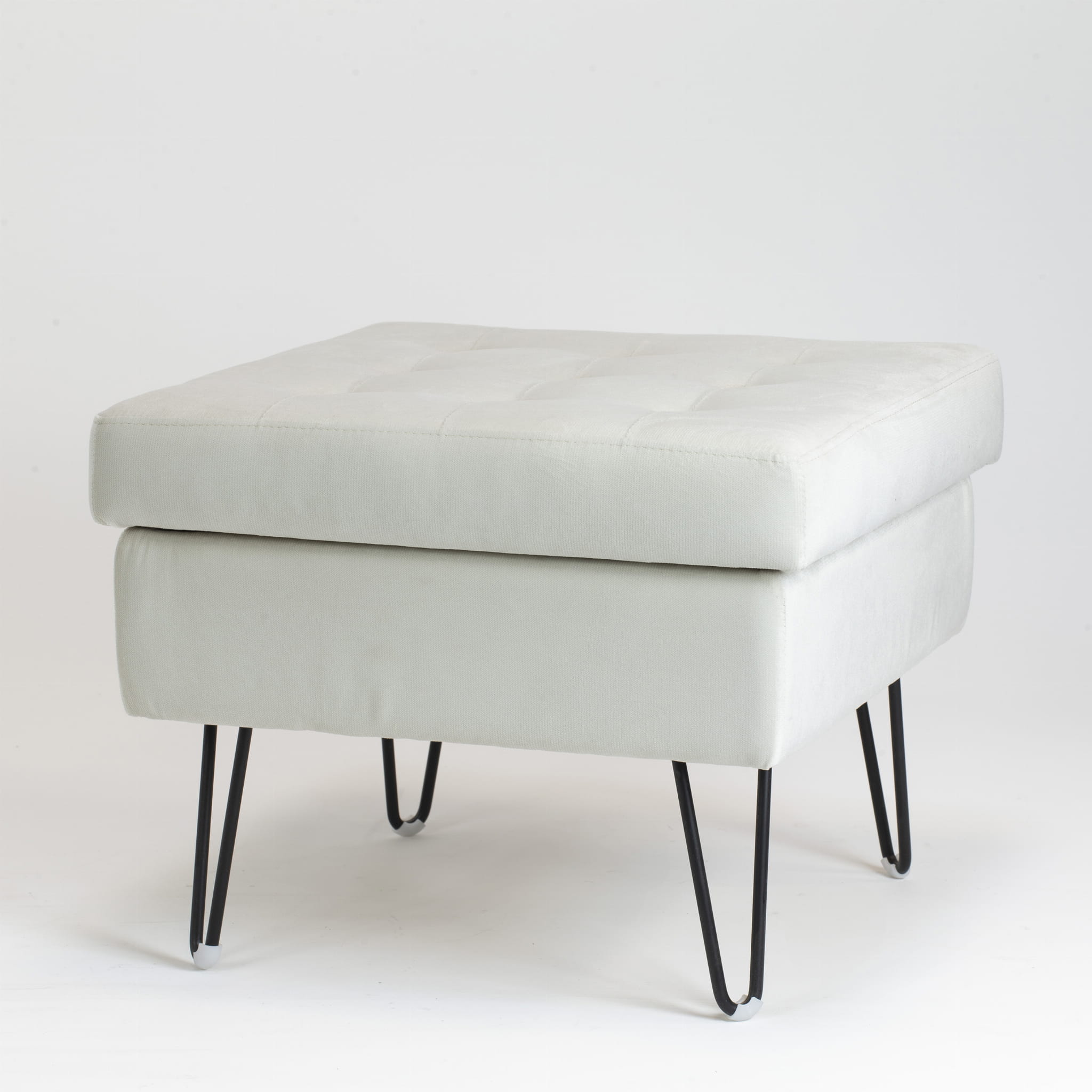 Pufa BERLIN to nowoczesny i funkcjonalny element wyposażenia wnętrza, który łączy minimalistyczny design z praktycznością. Jasna tapicerka w połączeniu z subtelnym pikowaniem na siedzisku nadaje jej elegancki wygląd, a metalowe, czarne nogi w stylu „hairpin” podkreślają industrialny charakter mebla.