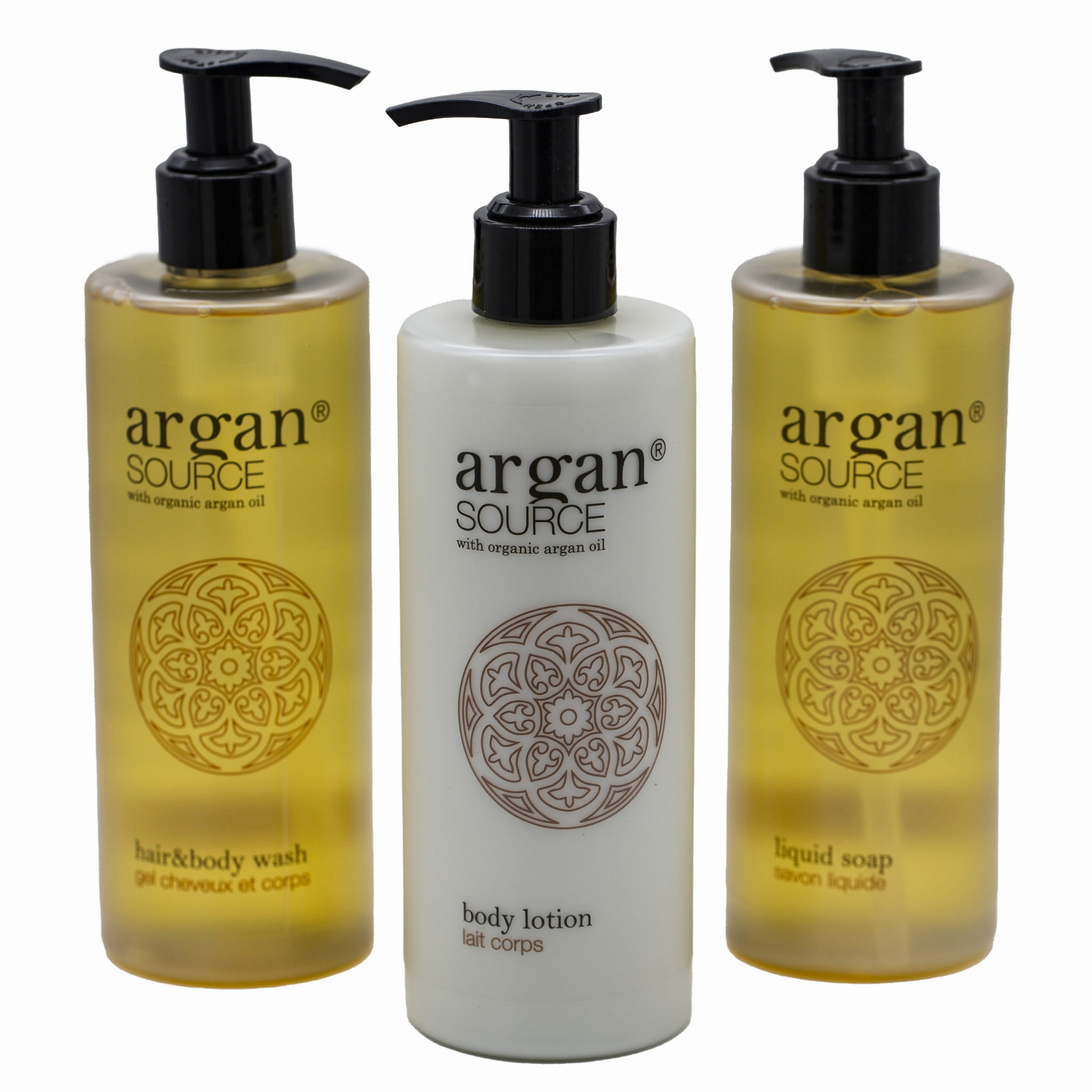 Zestaw kosmetyków 3x300ml Szampon-żel, mydło w płynie i balsam do ciała Argan w okrągłych butelkach 300ml